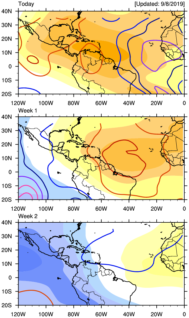 Once again I am seeing some indications of Hemispheric Patterns that could bring favorable conditions to the Tropical Atlantic in about 10 days or so and may well bring an active period as September ends and October begins. Two charts I look to suggest lower pressures as well as rising air and thus better conditions for tropical thunderstorms to develop with a Convectively Couple Kelvin Wave arriving around September 18th. Now that dust from Africa is no longer a problem and warmer sea surface temperatures are present across the Gulf, Caribbean and Main Development Region of the Atlantic, a burst of tropical activity could be in the cards. We will see.