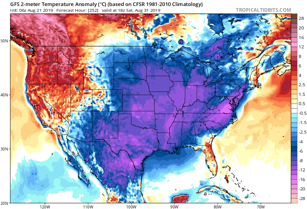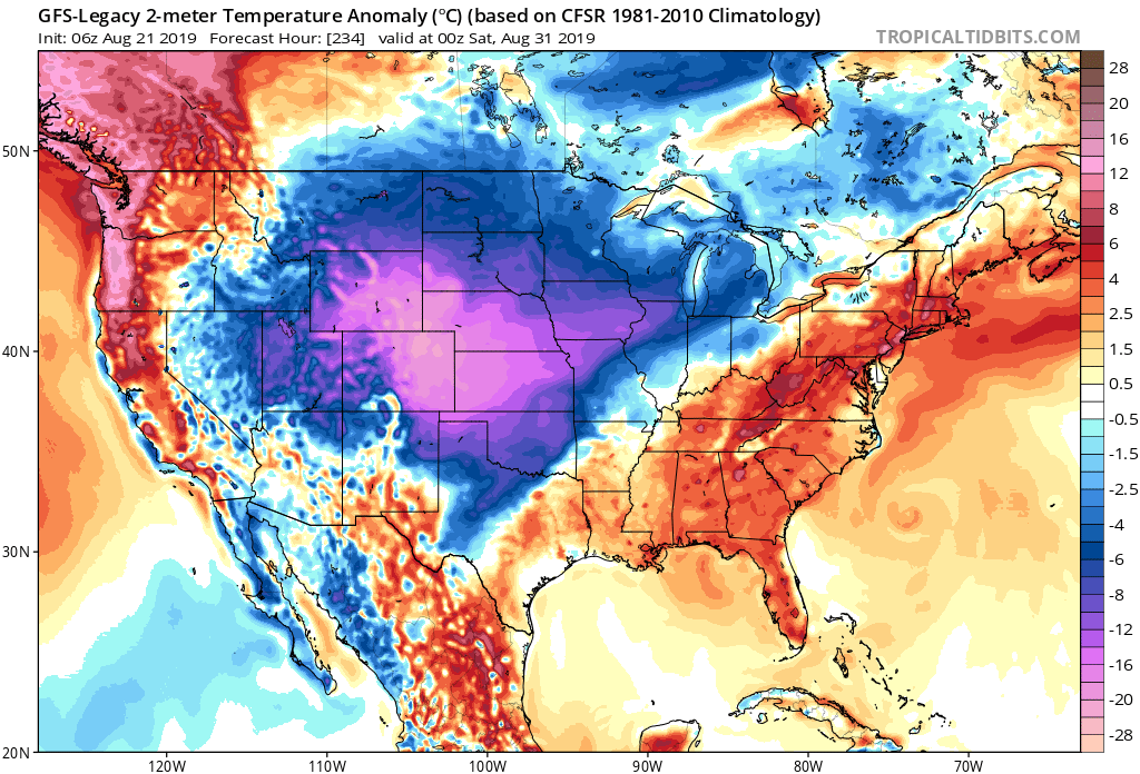 How big of a cool down could we be looking at? If the overnight/morning runs are to be believed, we could be looking at high temperatures potentially in the upper 70s to low 80s with lows in the mid to upper 50s... especially north of I-10. Below are snapshots of temperature anomalies as we close out August.