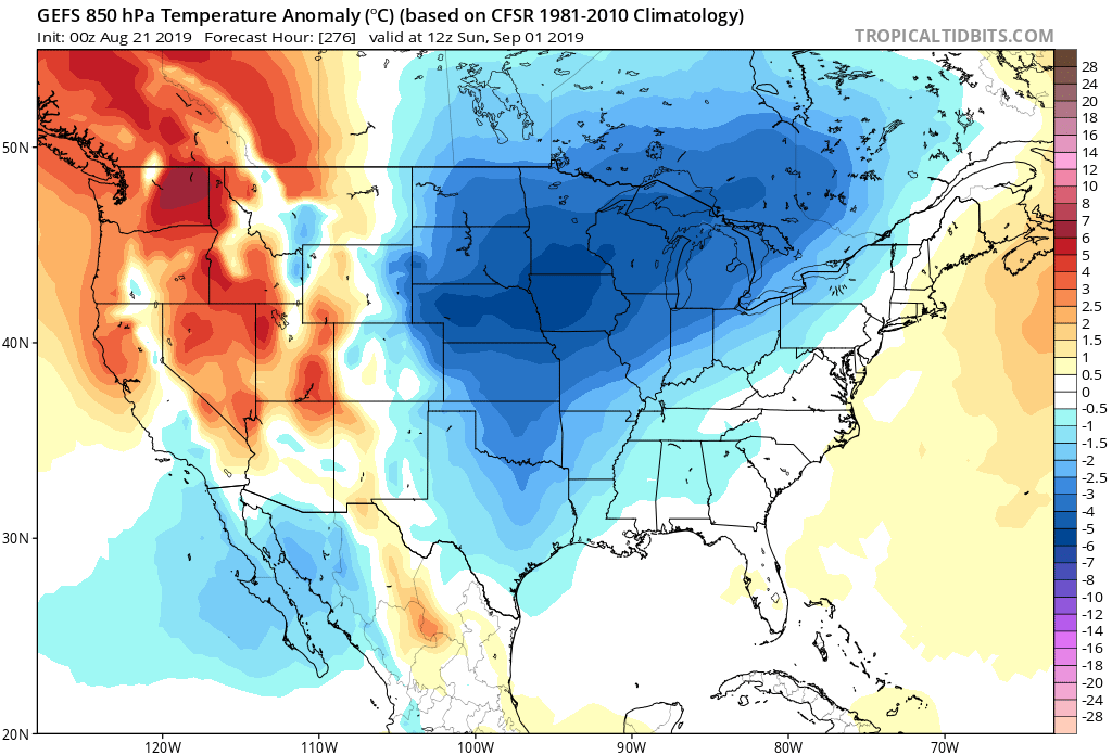 May not be that 'weak'. Almost every reliable model has a significant trough for 2/3 of the country come near the end of August heading into Labor Day Weekend. Not only is there model support for such a cool down, but many of those said models keep the well below average temperatures for at least 3-5 days rather just a one or two day cool down. This would be thanks in part to a large ridge that looks to set up in the north central Atlantic. These computer runs have been fairly consistent day-to-day so confidence is increasing as we close summer (meteorologically speaking) and work our way into Fall.