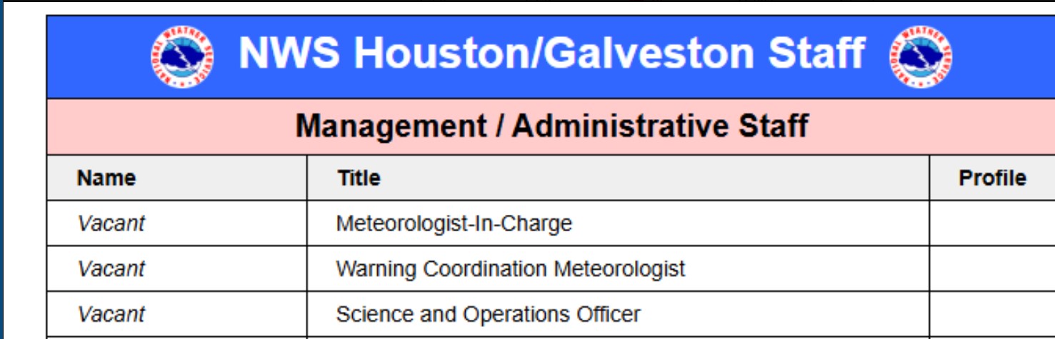 I want to be careful and clear here: Those that have remained in the NWS are eminently qualified individuals that are going to do their absolute best in a bad situation. These people are dedicated public servants. That said, anytime you're working in a job where there is a significant absence of leadership, that does absolutely nothing good for anyone's growth and development or morale. Remember, the Houston area is literally one of, if not the most disaster-prone in America.
