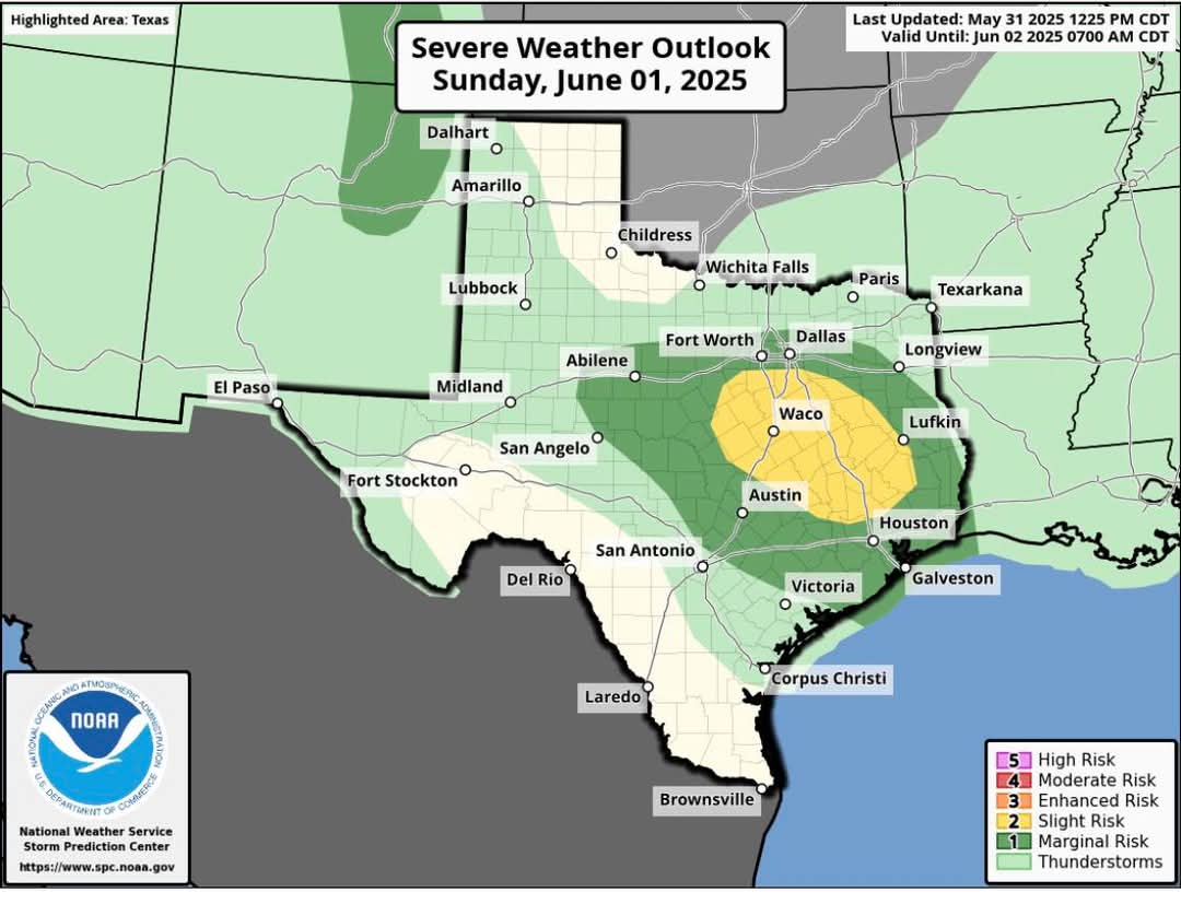 I-45 corridor (15-20%). Outside of the thunderstorm potential,