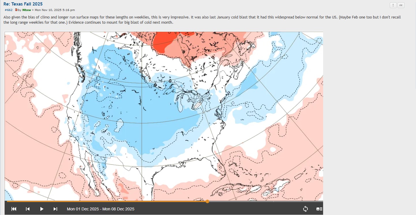 Late November- all of december looks to be cold for the central and eastern US, things could get interesting in Texas during that time frame