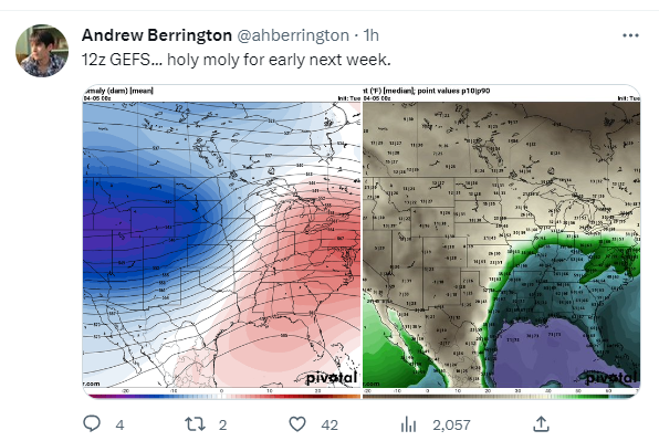 Potential rain bomb could be setting up somewhere. Don’t know exactly what part of Texas yet though or if it even happens at all.Stratton20 wrote: ↑Thu Mar 30, 2023 12:05 pm Global models are definitely trending much wetter during the first week of april