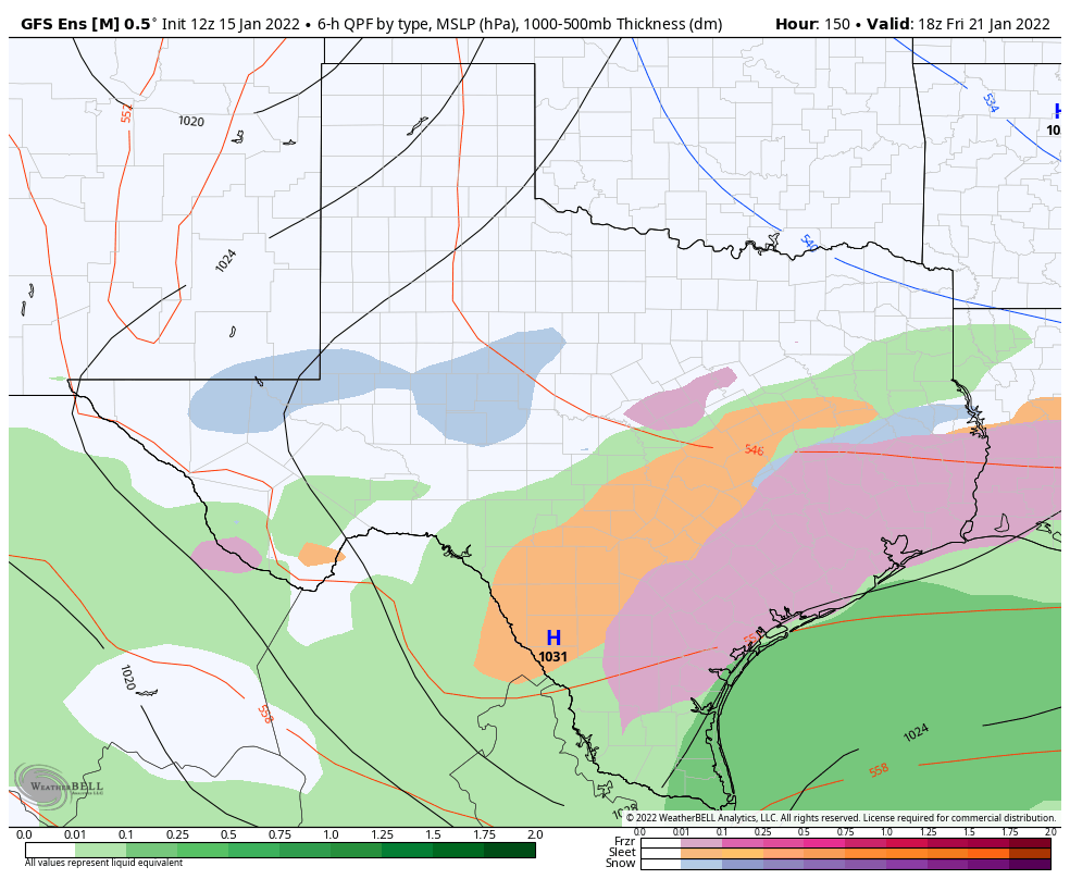 It shows some light snow accumulations out in the Hill Country. Kinda where the GFS had been showing it a few runs ago.Stratton20 wrote: ↑Sat Jan 15, 2022 1:49 am CPV17 what does it show? For some reason its not showing the 00z run for me