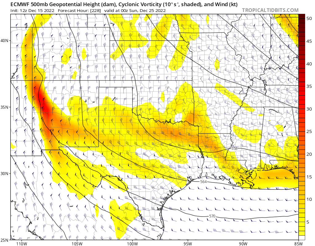 While not the best setup for snow for us,such setups have produced snow in the past around here.There will be energy moving in the northwest flow aloft with the trough.Models are showing a coastal trough trying to develop as the system digs around Christmas.We just need the system to dig a little more and slow down.The December 4th 2009 snowstorm had a similar setup to what the models are showing around Christmas.Temps don't look to be an issue just need enough lift.For a more significant event you would want the vorticity to come in around the 4 corners region and dip south of El Paso to produce a decent gulf low.Will be keeping an eye on this to see how models trend with the system over the next week.