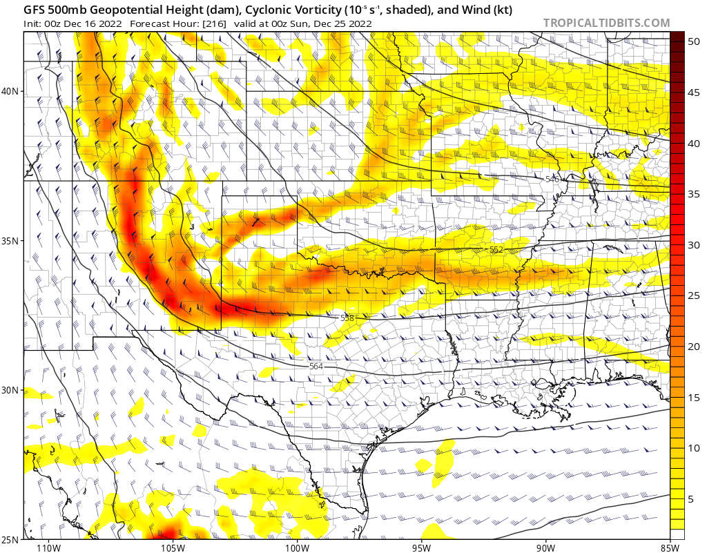While not the best setup for snow for us,such setups have produced snow in the past around here.There will be energy moving in the northwest flow aloft with the trough.Models are showing a coastal trough trying to develop as the system digs around Christmas.We just need the system to dig a little more and slow down.The December 4th 2009 snowstorm had a similar setup to what the models are showing around Christmas.Temps don't look to be an issue just need enough lift.For a more significant event you would want the vorticity to come in around the 4 corners region and dip south of El Paso to produce a decent gulf low.Will be keeping an eye on this to see how models trend with the system over the next week.