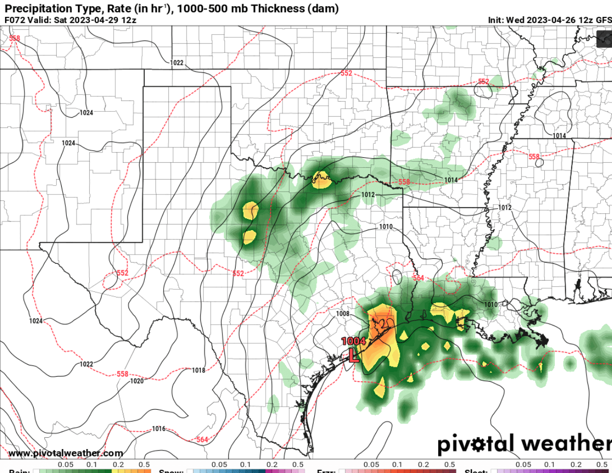 We need to watch this Friday/Saturday for a potential localized heavy rain event as a MCS moves in and a coastal trough/ low develops.There is still some disagreement on where the heaviest rains setup as some models have the heaviest rain in South Texas instead.But something to keep an eye on.(12Z GFS)