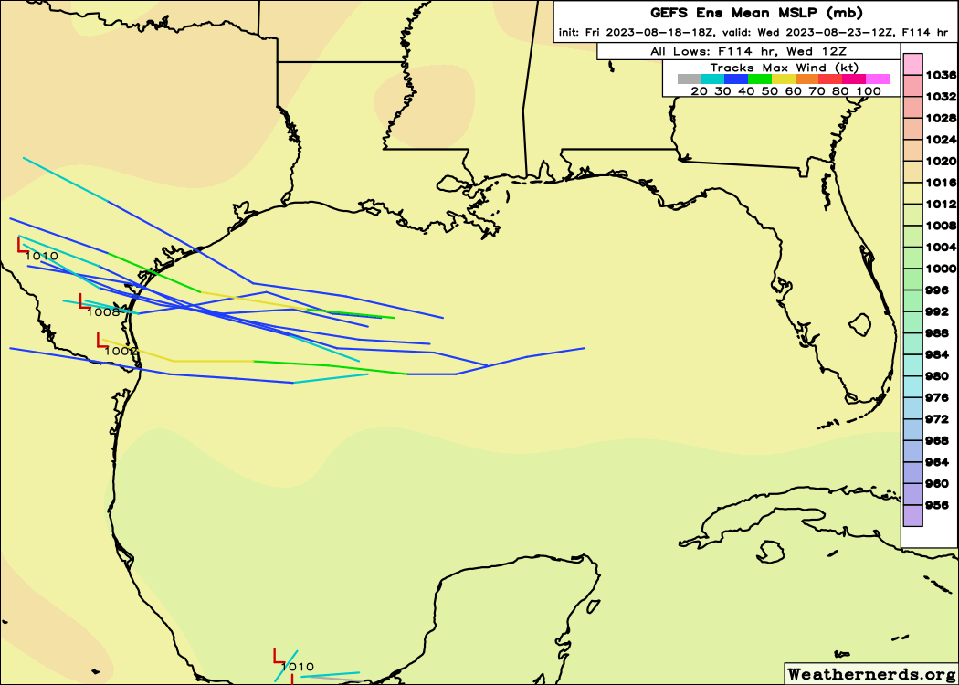 Stratton20 wrote: Fri Aug 18, 2023 6:39 pm Quite a big disagreement in the operational GFS vs its ensembles, OP GFS goes into N Mexico but the 18z GEFS is pretty well far north of its op run, more clustered around corpus or just north of it, interesting disagreement, a track near corpus would at least improve rain chances in se texas a bit more