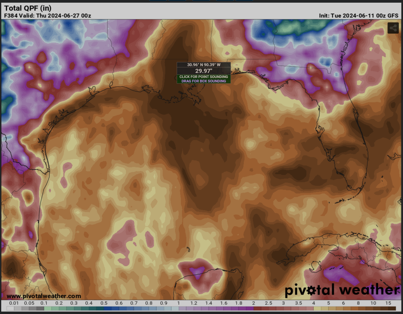 869MB wrote: Tue Jun 11, 2024 1:31 am The 6/11 GFS 00Z Run is a very wet run for the Gulf of Mexico and the Gulf Coast States. It even has a 29.97-inch bullseye total along the Louisiana/Mississippi border. Be mindful that these totals will shift around as we draw closer to the moisture surge/possible tropical development....