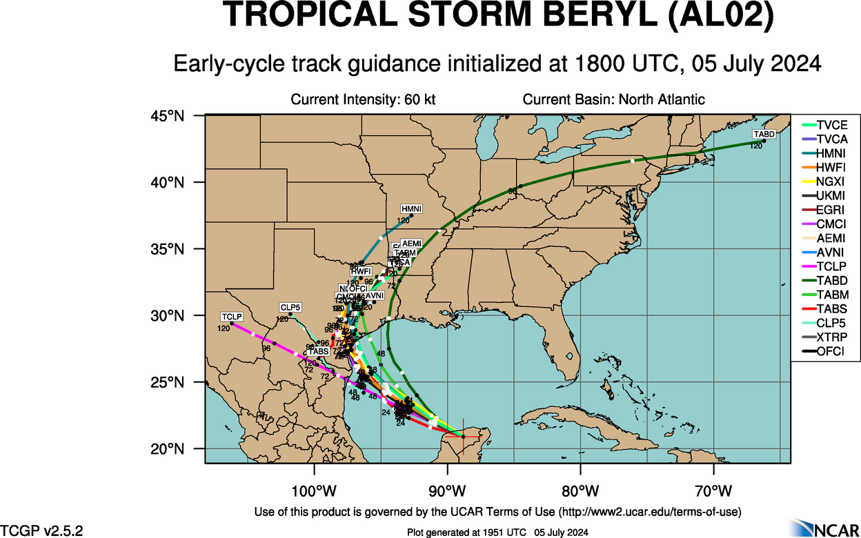 “Hey everyone. From someone who follows weather closely, especially hurricanes, I’m here to tell you that you better pay *very* close attention to Beryl over the next day or so. Trends are not looking good fo SE Texas; even though the current projection is Brownsville, things are changing fast and we may have a serious situation developing by Sunday. Have your plan ready, get your supplies NOW if you don’t already have them, and watch the weather at least twice a day. Not trying to scare anyone per se but Beryl is a unique storm and it’s acting very atypically of a storm this time of year. Be prepared and be knowledgeable!”