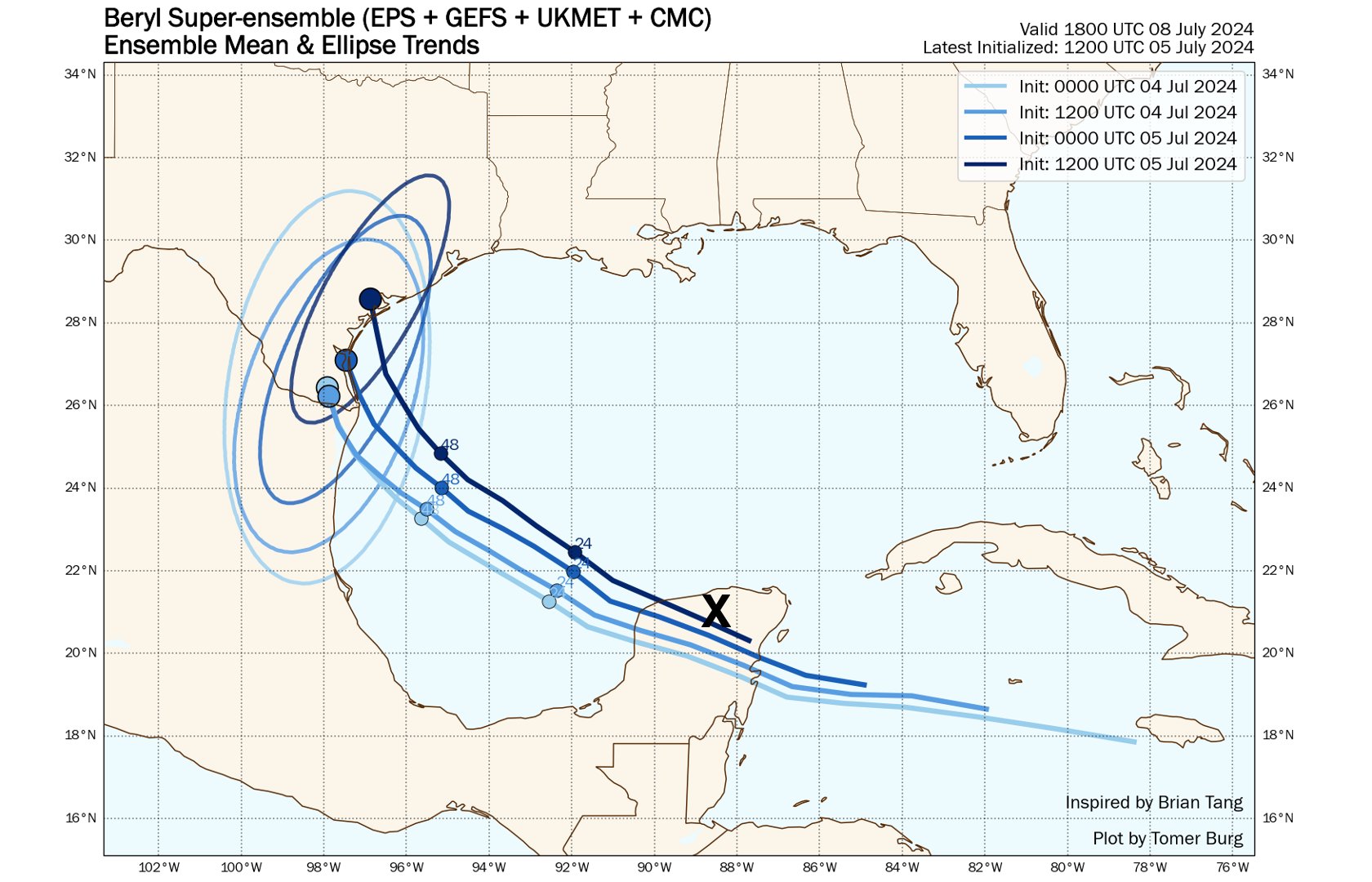 This afternoon's multi-model ensemble mean again adjusted to the right with a stronger Beryl - and again, Beryl's observed location is already north of the ensemble mean track: