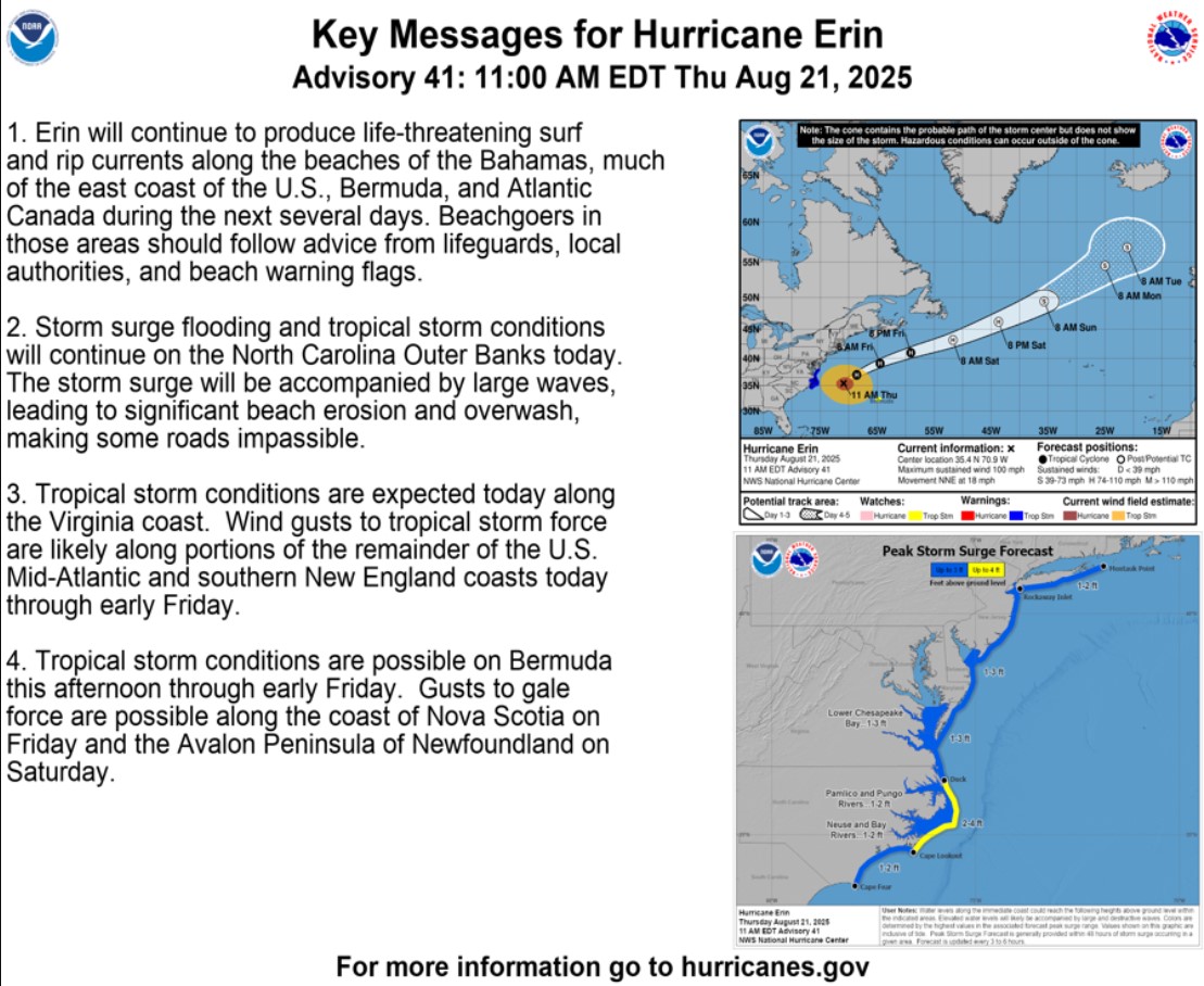 In brief: Hurricane Erin is passing by the Outer Banks today, and it will begin to accelerate out to sea. Coastal flooding will remain an issue into tomorrow for the East Coast, particularly from North Carolina into New Jersey. Mostly wave impacts for Atlantic Canada, but also perhaps some wildfire concerns there too. The rest of the tropics are noisy, but only one wave bears much watching (Bermuda). Also, the latest on upcoming heavy rains in the Plains.