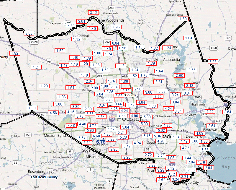 Here's a rainfall map from Harris County Flood Control showing yesterday's rainfall across the area. I ended up with a total of 6.78", which is higher than any report on the map. My house's location is in blue just west of the SW corner of 610. Next to it is the gauge at Brays Bayou and Gessner with 6.6". I'm just south of Brays Bayou at Hillcroft, 2 miles ESE of that gauge or so. This explains why Brays Bayou was so high yesterday.