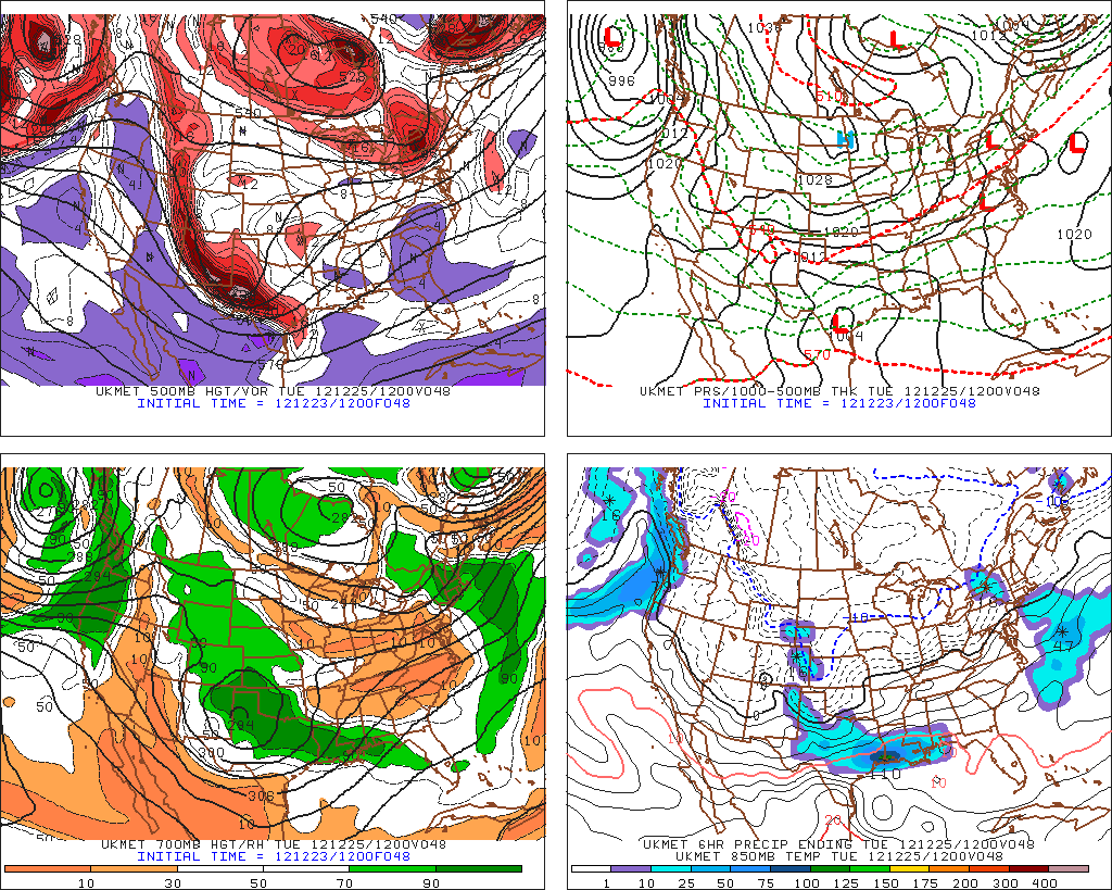 Dry line will punch rapidly through the area by noon on Tuesday with a quick drying of the air mass. Strong cold front will lag behind the dry line and cross the area in the late afternoon. Very strong winds will onset once again behind this boundary…although not likely as strong as last Thursday…still could see a few gust to 40mph. Temperatures will tumble from the 60’s/70’s prior to the front quickly into the 40’s behind the front. A band of snow will likely develop over N TX within the comma head portion of the upper level storm system. Some accumulation of snow will be possible from the DFW area NE into OK and AR on Christmas Evening and night. No snow is expected across SE TX as moisture will be scoured out of the area prior to the thermal column being cold enough for snow.