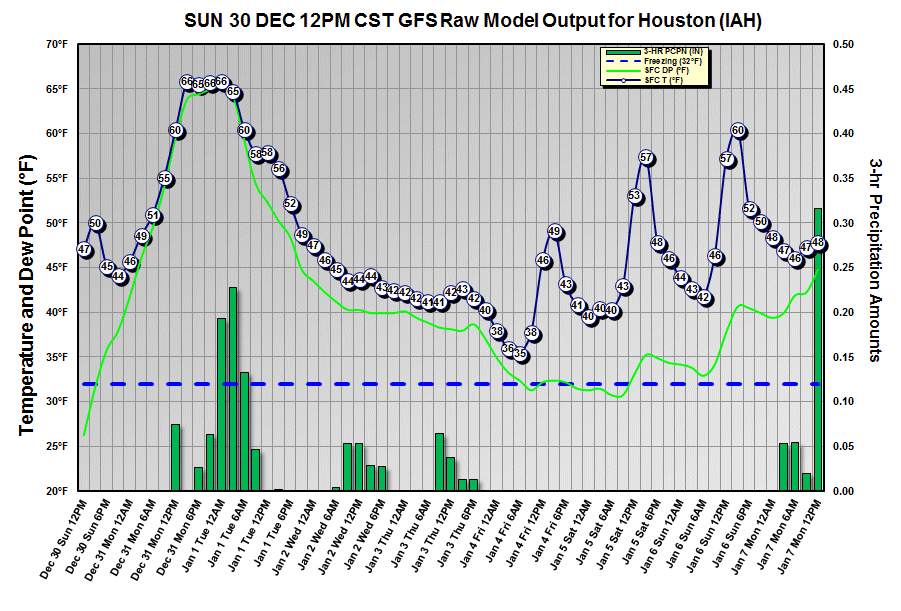Other question to deal with is the threat for any frozen or freezing precipitation in the Wed-Fri period. ECMWF would suggest a chance of rain changing to snow NW of a line from LaGrange to Brenham to Conroe on Thursday as cooling aloft with the upper trough moves into the area. GFS shows a much drier profile and does not support snow in the area, although Thursday morning dewpoints at College Station are in the upper 20’s/low 30’s with air temperatures in the mid 30’s…but this would still suggest rain as there would be little room for evaporative cooling. For now will keep everything rain, as the upstream air mass while cold is not overly cold for this time of year and there is not significant model agreement on moisture or temperature profiles over the northwest 1/3rd of the area for Wed-Thur. Will need to keep a watchful eye on this aspect moving forward over the next 24-36 hours