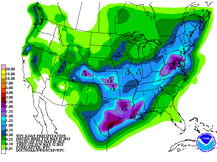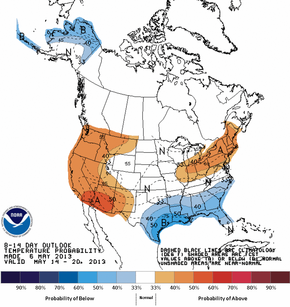 As we saw yesterday afternoon when elevated storms and high/mid level clouds rolled in from the W, a transition in the pattern is beginning. Currently an upper air disturbance is located near California and will begin to move inland and weaken. Embedded short wave disturbances will move beneath a developing Western trough and translate E into Texas this week into the weekend. The Storm Prediction Center has outlined a couple of days of Slight Risk across W Central Texas and Oklahoma for Wednesday and Thursday. Moisture return looks to increase by late Thursday. Friday and Saturday look to be rather wet and stormy with additional disturbances cross the area. A ‘cold front’ should move into the Gulf on Sunday bringing cooler temps again, but not as ‘cold’ as the last front. The Climate Predication Center continues to forecast below normal temps as we head into the latter half of May as well.