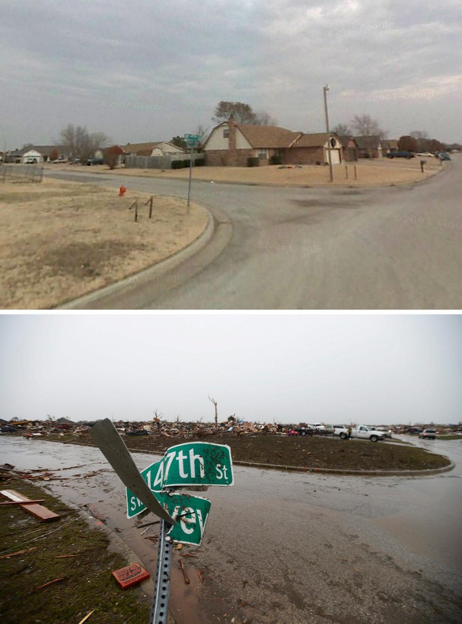 The surprisingly low number of fatalities for such a large tornado is likely attributed to the time of day which the tornado hit and the longer than average lead warning times. The tornado struck in the middle of the afternoon when most residents were at work and not at home unlike the Joplin, MO tornado (Sunday evening at dinner time) and the 5-3-99 Moore Tornado which struck after 600pm. Most of the damage with this tornado occurred in subdivisions and luckily many of the homes were not occupied at the time of the tornado. It is also clear that the two elementary schools impacted offered some of the best shelter/protection even though they suffered extensive damage as noted in the damage photos below of the surrounding subdivision. Children being in those schools and not in the surrounding homes where many likely lived saved their lives.