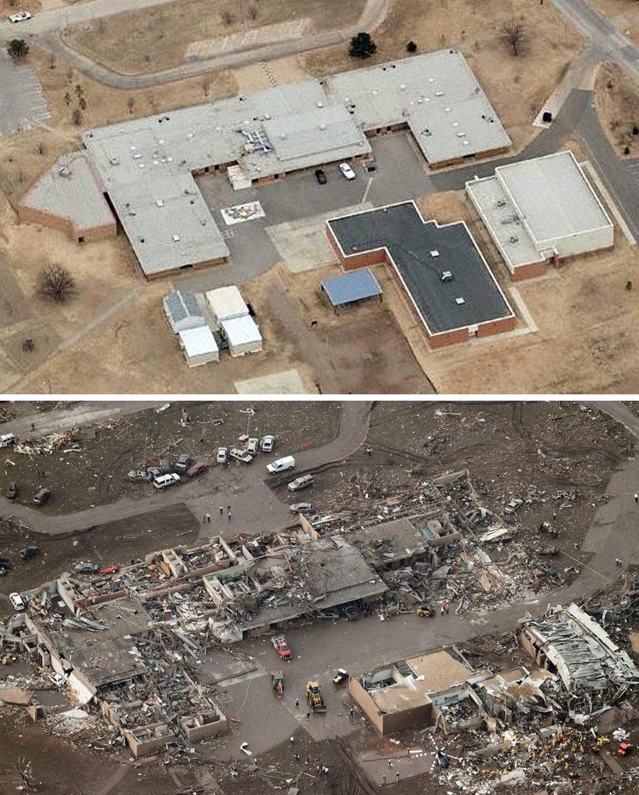The lead warning time for this tornado was 16 minutes or nearly double the average. Most residents in the path knew the tornado was coming and did exactly the correct tornado safety precautions. In the areas of EF5 damage in/around the elementary schools unless underground there was little hope of surviving. The large diameter of the tornado (1.3 miles) suggest a single location in the funnel may have sustained winds of 150-220mph for over 1 minute....a very long time. There is little doubt that the numerous tornado shelters installed in many homes after the 5-3-99 tornado saved many lives in this event. Tower Plaza Elementary School: Brairwood Elementary School and surrounding subdivision: Moore Medical Center Ariel Damage Images: