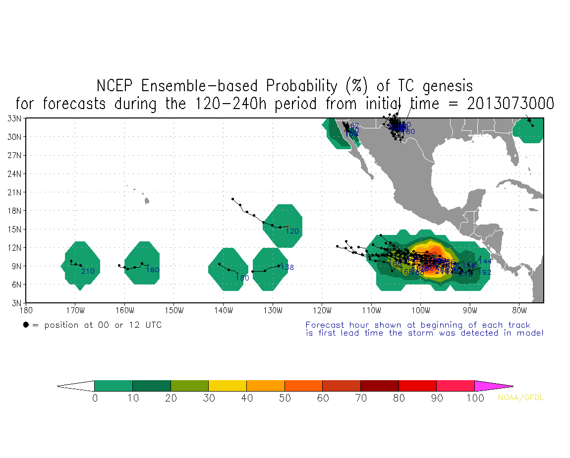 99E continues to organize well offshore of the Pacific coast of Mexico and the NCEP Ensemble TS Genesis Probabilities are increasing with a potential developing cyclone SW of the Gulf of Tehuantepec as a favorable MJO pulse moves E across the Pacific.