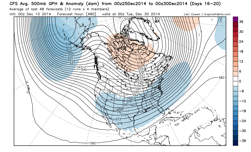After an unusually cold and dreary November that brought record breaking cold across much of North America, I think everyone expected the pattern to relax a bit. As we have talked about over the years, we live in the mid latitudes where extreme cold is a rarity versus wall to wall cold. Give it time. Even the very long range CFS ensemble mean is suggesting that pattern flips back to a 'colder regime' near Christmas.djmike wrote:Wow...seems that the "long-lasting" cold is late for this time of year. Especially if our next really cold shot is'nt until after Christmas....Dec. 4 2009 we had 3-4" of snowfall on this date!