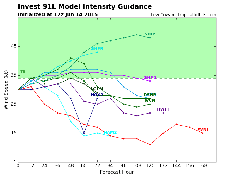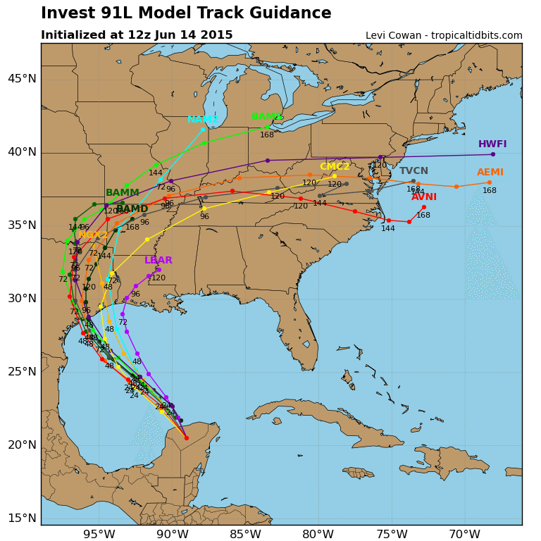 12Z Track and Intensity guidance for 91L still clustered along the Middle/Upper Texas Coast.