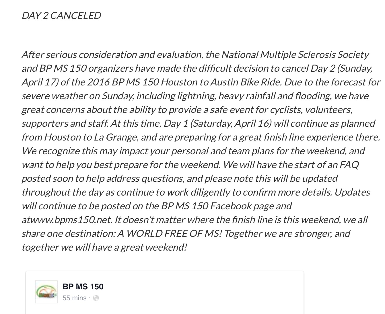 I'm sure it was a difficult decision, but I think it's the right one given the chance of severe weather before the riders reach Austin on Sunday.