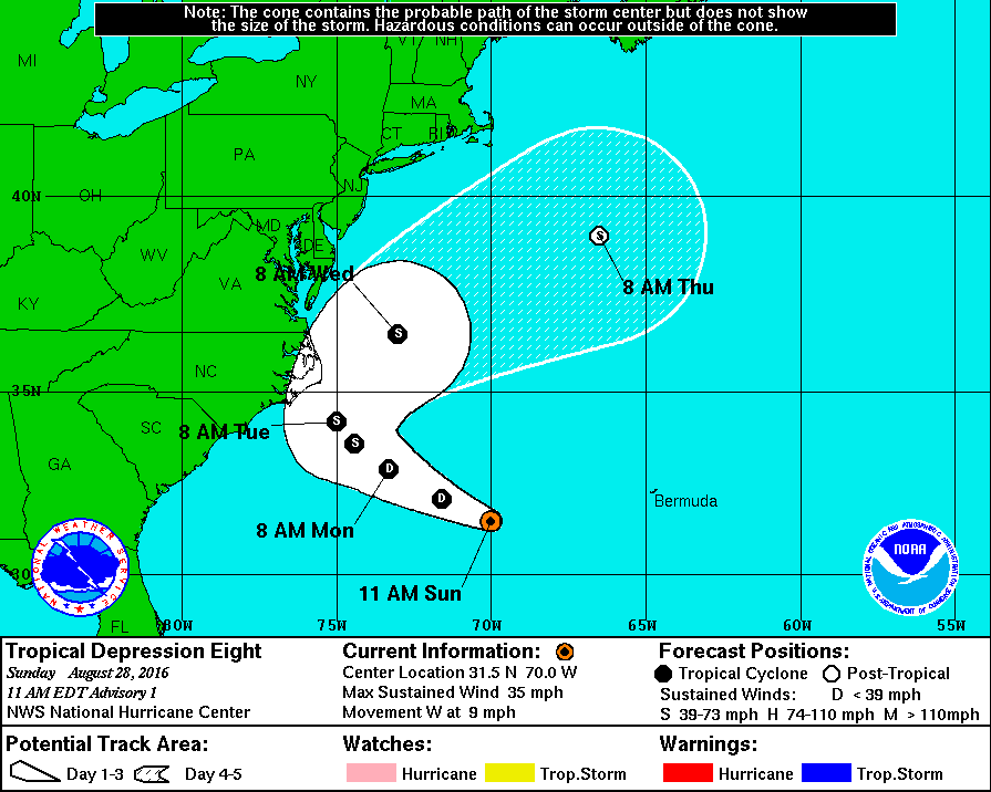 Tropical depression 8 has formed this morning west of Bermuda. The system shows a fairly vigorous low level circulation and recent deep convection on the NW side of the circulation. There is enough organization to upgrade the system to a tropical depression and a USAF mission will investigate the system this afternoon. High pressure building over the western Atlantic has trapped this system on it southern flank and #8 will move generally westward in the direction of the NC coast over the next few days and then turn abruptly toward the N and NE as it nears the coast ahead of a strong mid level trough over the NE US by mid to late week. IT is certainly possible that TD 8 could make landfall across eastern NC as a tropical storm before the hard right turn occurs.