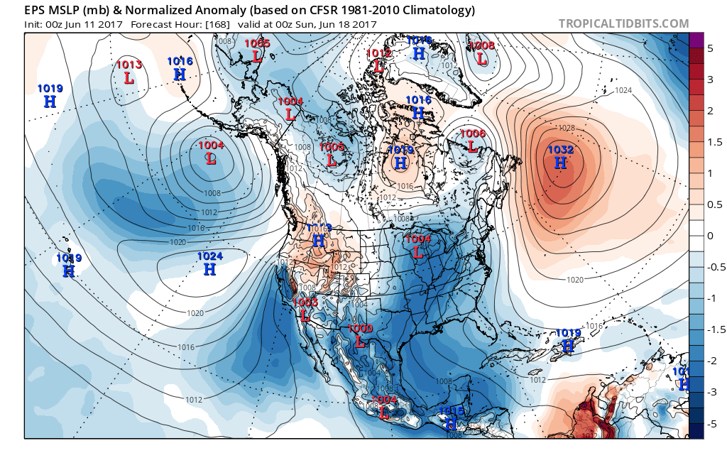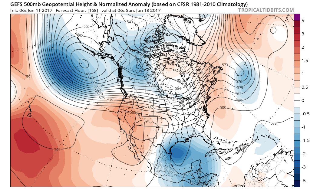 Focus continues to be in the longer range period from roughly the 18th of June onward with now several global forecast models including the GFS, ECMWF, CMC, NOGAPS, and many of their ensemble members developing a large monsoon circulation over the western Caribbean Sea/central America after the 19th. It will be important where this feature actually forms, if at all, as to what chances of development it may have. One important factor that continues to show up in the 500mb height fields is a general weakness over the NC Gulf of Mexico and trough axis across the Great Lakes into the Ohio Valley. As mentioned above upper level ridging never really builds across the US Gulf coast over the next 2 weeks which may leave the door open for any possible tropical development to migrate northward. In fact the latest ensemble clustering has shifted northward away from central America and into the SE/S Gulf of Mexico over the last few runs with a general average position of a very large low pressure system somewhere near/N of the Yucatan between the 18th and 23rd of June. This is all still way out in model la la land…but the increasing consistency is something to watch.