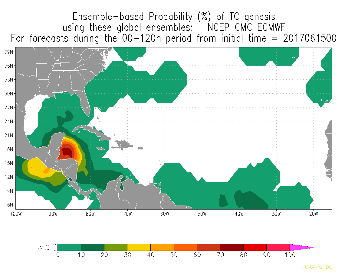 A complicated pattern will evolve across the western Caribbean Sea and southern Gulf of Mexico this weekend which may give rise to the formation of a tropical storm in the Gulf of Mexico by late this weekend or early next week. A tropical wave currently moving through the Caribbean Sea will arrive into the western Caribbean Sea early this weekend while a northward lifting trough off the coast of Panama will interact with this wave. Convection has been increasing over much of the western Caribbean Sea over the last 24 hours and expect a continued increase in thunderstorm develop as these two features interact.