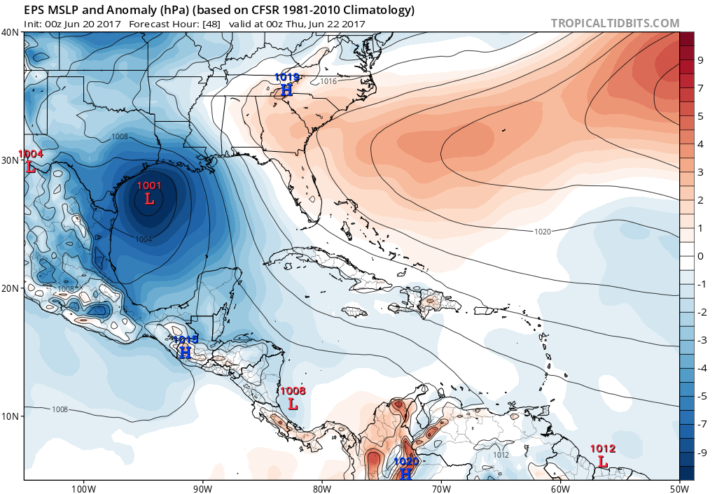 50 members of the 00Z ECMWF Ensembles also suggest an Upper Texas Coast landfall is very possible.