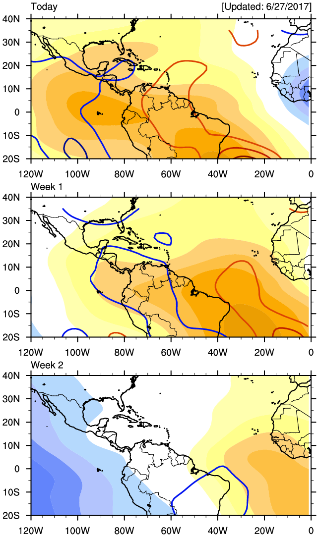 It appears the Tropical Atlantic will be quiet the next couple of weeks while the Eastern Pacific begins to become a bit more active which is somewhat typical for July.
