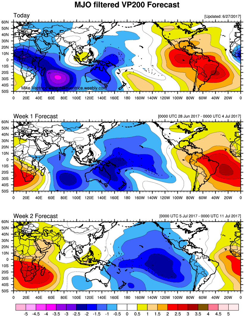 I am watching for the possibility for more favorable conditions around mid July into early August as the Madden Julian Oscillation moves East of the Dateline and toward the Pacific Mexico Coast and then enters the Western Caribbean around July 11th to 15th. The morning Update MJO and CCKW graphics suggest we may need to turn our attention toward the Tropics as we get a bit closer to Peak Season in the Atlantic Basin.