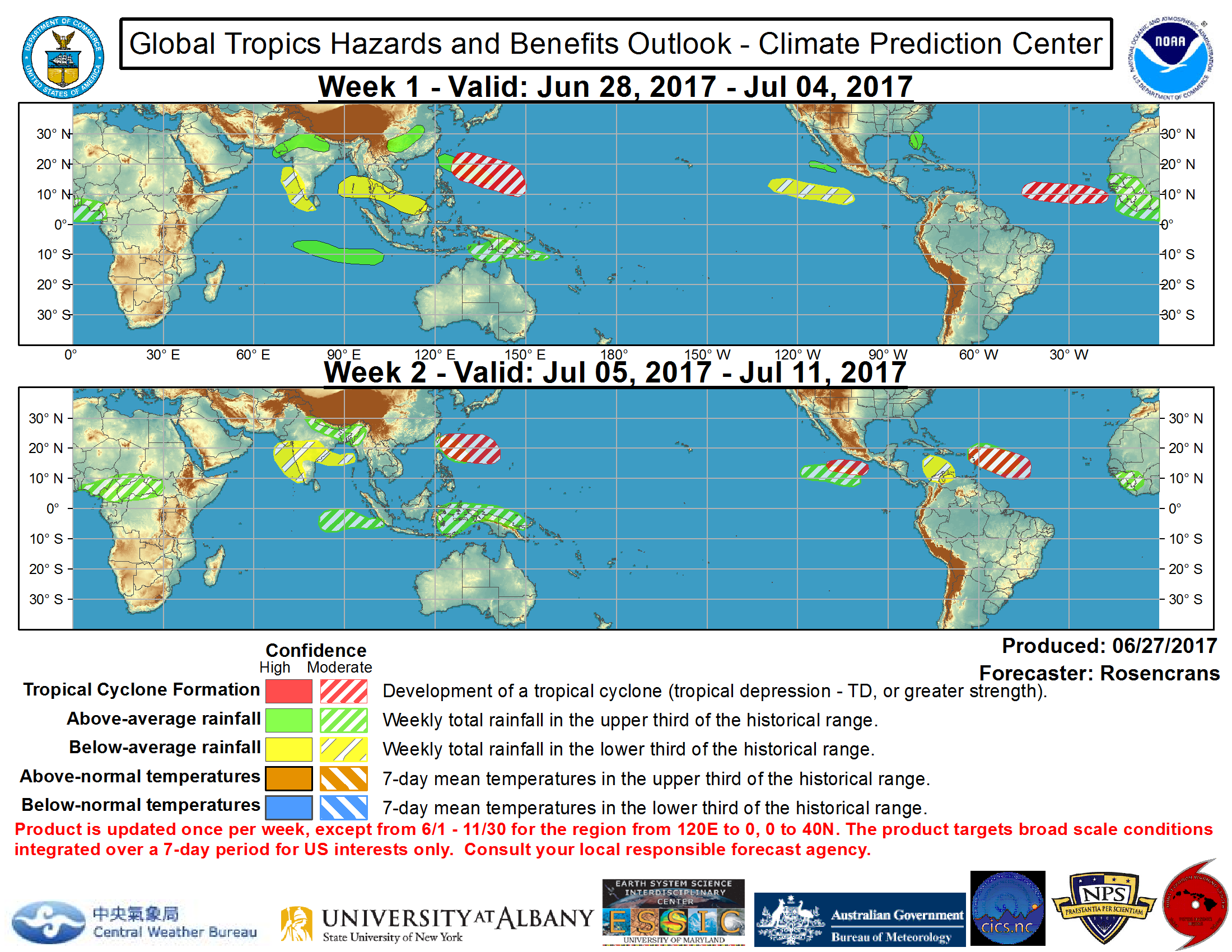 The Climate Prediction Center Update for Global Tropics Hazards suggest a potential increase for Tropical Development across the Atlantic beginning next week and spreading West during the Week 2 timeframe.