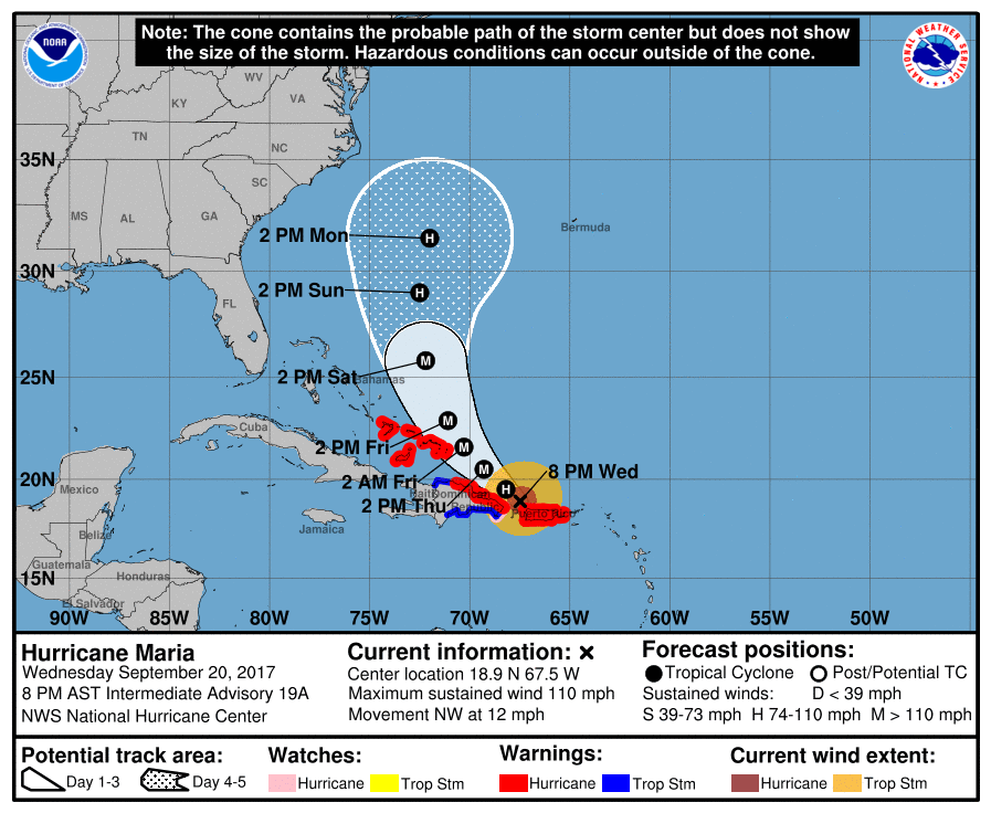 Overall track guidance remains in good agreement with Maria turning NNW and N over the SW Atlantic as tropical storm Jose off the NE US coast continues to produce a break in the sub-tropical ridge over the central Atlantic and a building ridge over the NE US/SE Canada. One concern is the potential for Jose to weaken faster and the high latitude ridging over the NE US building across the NW Atlantic which would effectively block Maria’s potential escape path offshore of the US east coast. At this time, this appears to be only a small potential, but something to watch in the coming days, as any building high pressure to the N of the hurricane would turn it back toward the NW and toward the US east coast.