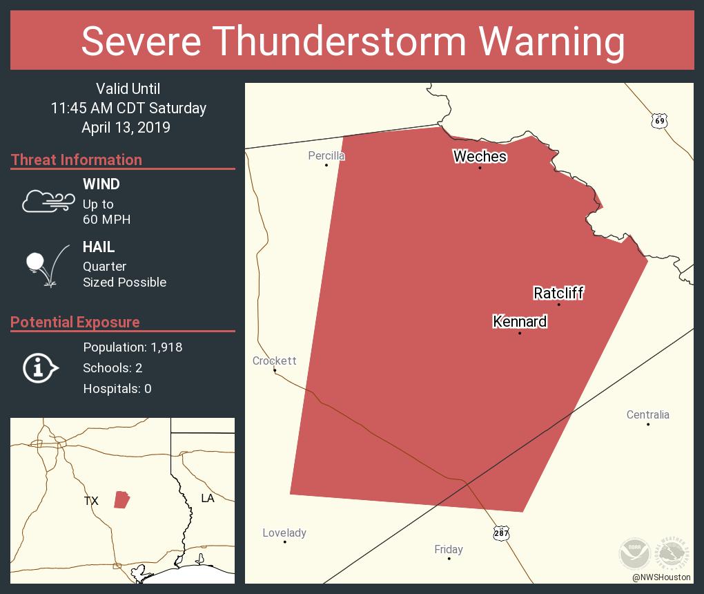 Severe Thunderstorm Warning including Kennard TX, Ratcliff TX, Weches TX until 11:45 AM CDT