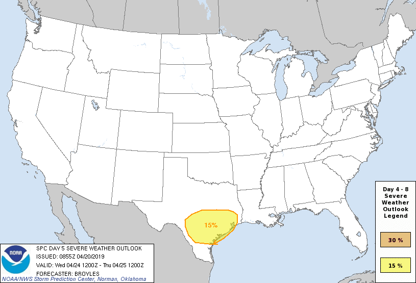 The Storm Prediction Center has outlined at 15% chance of severe thunderstorms for Wednesday (Day 5). So far the 12Z models are suggesting a dynamic upper level trough traveling further South across Texas. Everyone enjoy the beautiful Easter Weekend Weather and we'll watch for the next strong storm system arriving this coming Wednesday!
