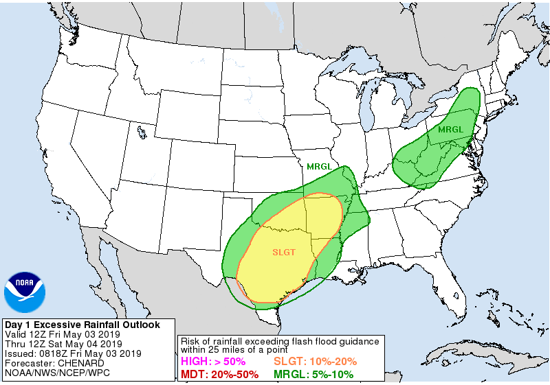For today, the Weather Prediction Center has outlined a large Slight Risk for Excessive Rainfall for most of us. Some of the models suggest someone could get up to 5 inches of possibly training heavy rainfall this afternoon into the overnight hours. With so many boundaries around and mesoscale features that cannot be determined beyond 6 hours, it's almost impossible to make a call on the exact location that may get the heaviest of the rain.