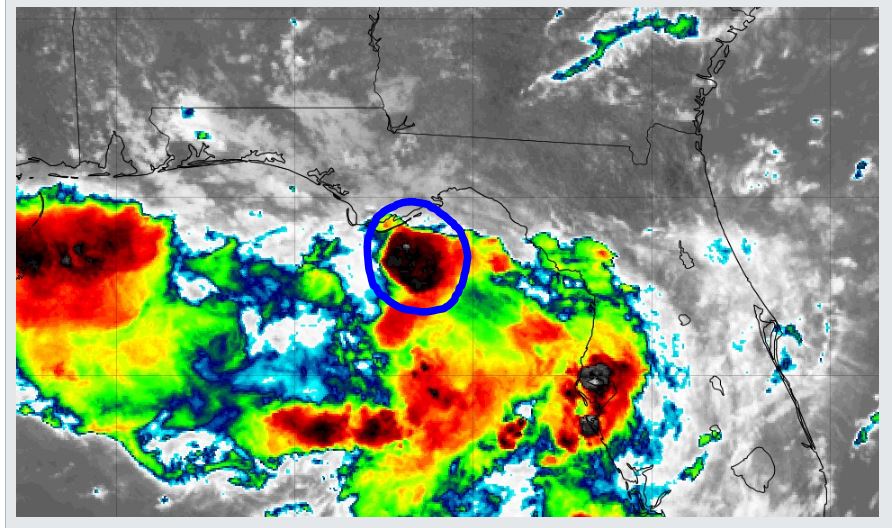 1. A broad low pressure area has emerged over Apalachee Bay in the