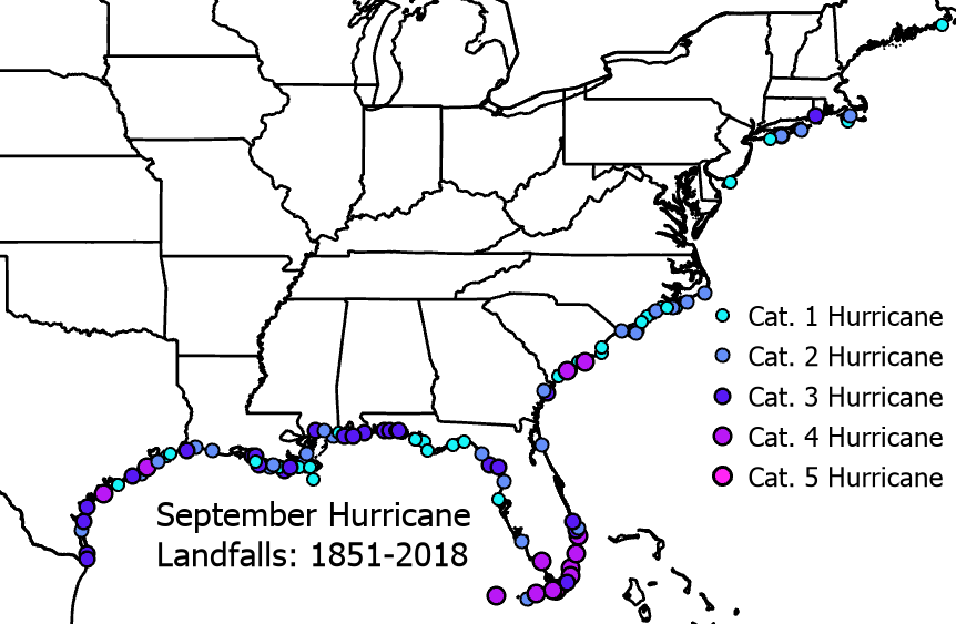 September continental US #hurricane landfall locations since 1851. 39 out of the 121 September continental US hurricane landfalls have been in Florida. #HurricaneDorian