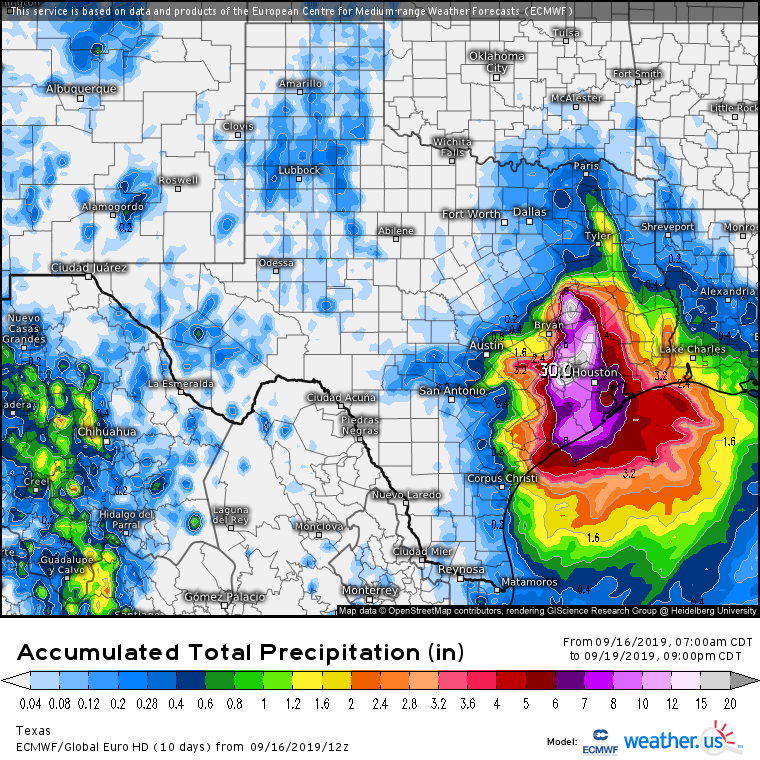 Cpv17 wrote: Mon Sep 16, 2019 12:52 pm On the next Euro update at 12z, I would expect to see the heavier totals shift east once again. Probably over Galveston and then Baytown then north into Liberty County. Seems about right seeing the east trends. Chances of rain diminishing with each model run for the western parts of the viewing area.