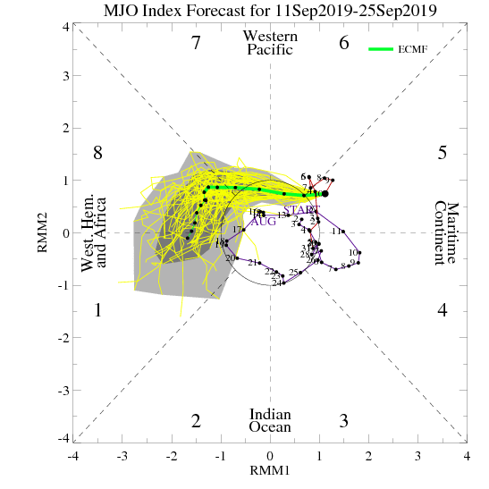 The overnight Euro does show a weak front around September 21/22, but nothing earth shattering. I continue to be cautious with the various computer schemes as the Hemispheric pattern looks to be transitioning to a volatile setup. A very vigorous Convectively Coupled Kelvin Wave is moving our way across the Pacific and there are some indications the MJO may actually wake up and move into a favorable phase in our side of the Globe for increased tropical development potential. That said we are midway through the month of September and a transition to Fall is a certainty as the days getting increasingly shorter.