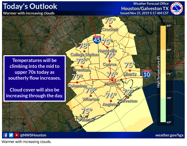 Many areas across SE TX are in 50s this morning. Expect highs in the mid to upper 70s today with increasing clouds. Showers Tuesday afternoon will be followed by thunderstorms Tuesday night with the next cool front.