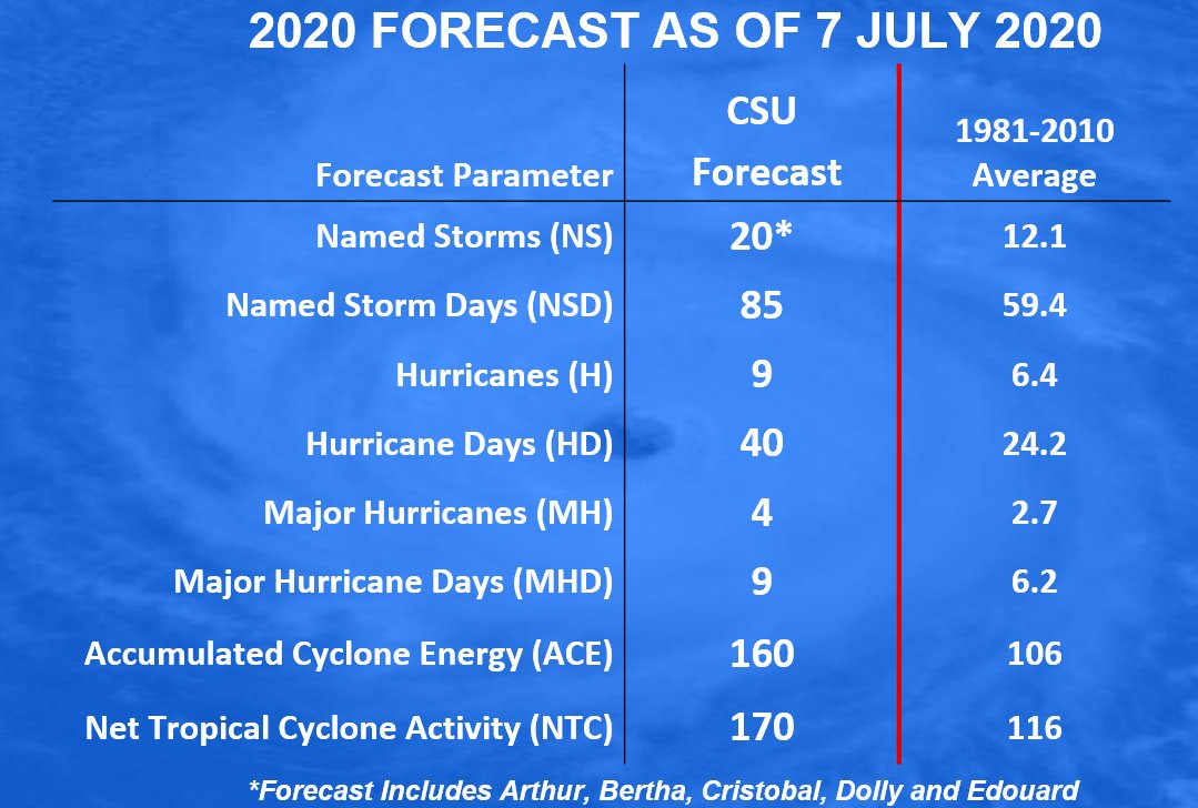 Phil Klotzbach and his CSU team have further increased their Seasonal Outlook for the 2020 Hurricane Season. 24 named storms, 12 Hurricanes and 5 Major Hurricanes suggest an extremely active Season across the North Atlantic Basin. The upgraded numbers include the already named storms and 2 Hurricanes.