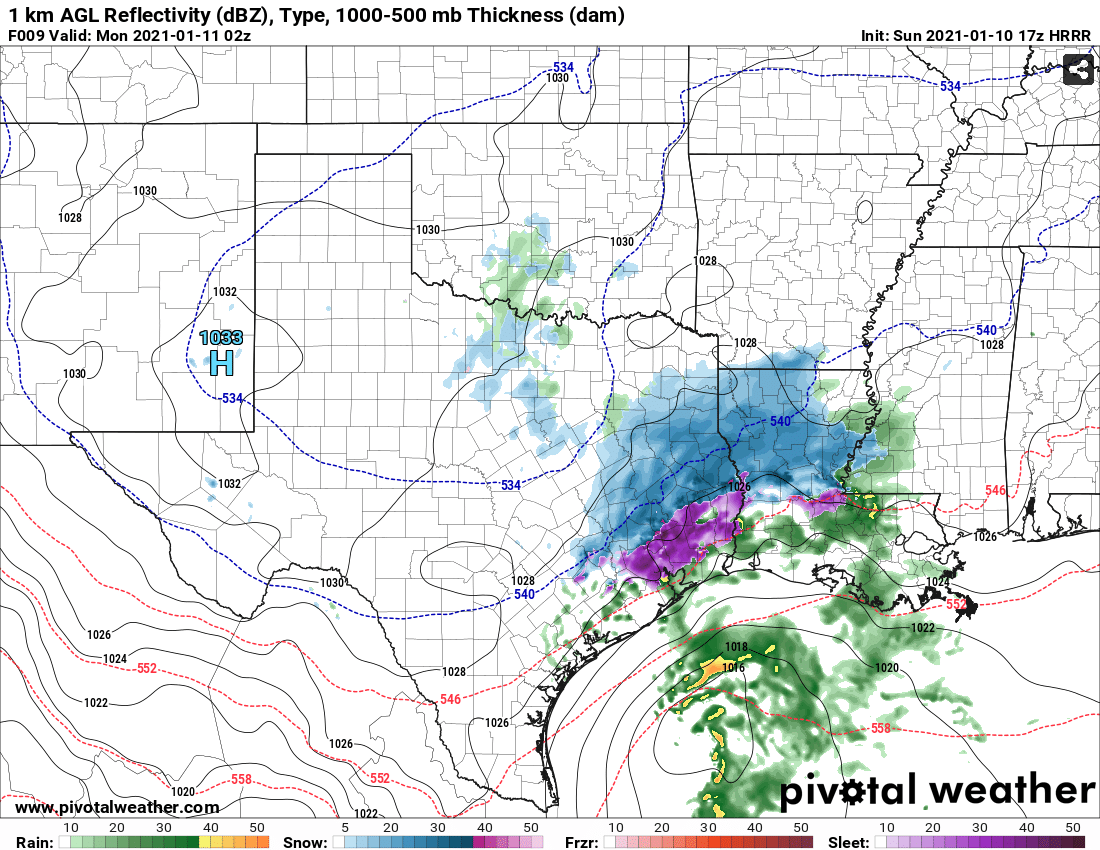 Love all the purple, and can’t help but notice that bit of blue trailing off to the SW of Harris County. Maybe it can hold together all the way to Houston.don wrote: ↑Sun Jan 10, 2021 12:51 pm The main event wont start until late afternoon through the night.When the trowel or wrap around moisture becomes enhanced with cold air advection filtering in at the same time. The HRRR has been consistent since last night on showing this,that is also the time when the precip may become heavy at times.