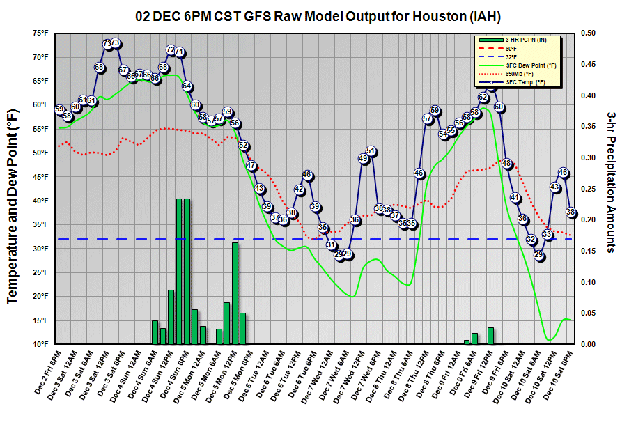 The 06Z GFS seems to have had a problem with the front. Check out the 00Z run meteogram below. It's a bit colder than yesterday's runs but doesn't have the precip in with the coldest air. Could still be having a problem advancing the upper trof too quickly. Canadian keeps the precip here a lot longer. Note that this is the type of airmass that gives the models fits. They are frequently way too warm on temps, holding back the cold air to our north due to the incorrect perception that southerly winds at the surface or SW winds aloft won't let the cold, dense air sink southward.djmike wrote:Wow...well from what I am reading this morning, it sounds like this cold front is fizzling out a bit. Less rain, not as cold temps (as we thought) and "for sure" no wintery precip of any sort! This will be like all the other cold fronts we've gotten so far. Seriously, this might be my first "very small" letdown for this winter season for SETX. Oh well.... I'm sure many more to come