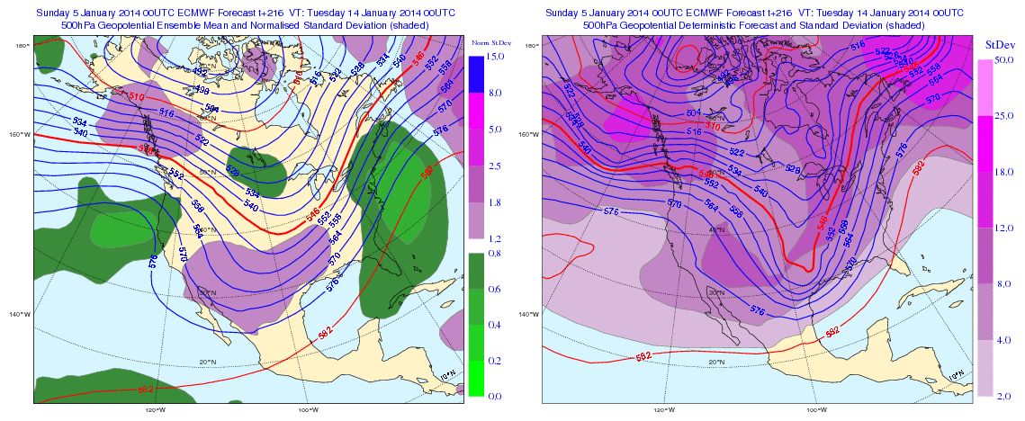 Fore a teaser while we are dealing with the Arctic cold snap, attention turns to the medium/long range across our Region. After the Arctic chill transitions to a moderating split zonal flow, a parade of Pacific storms track beneath the Gulf of Alaska Ridge and develop an increasingly deep Western trough. Cool and unsettled weather returns to the West Coast where increasing Pacific moisture returns to Washington/Oregon and Northern California. As the week progresses and the Arctic high pushes E, a return flow off the Western Gulf appears to set the stage for increasing moisture and perhaps some heavy rainfall across TX into LA by next weekend. The GFS/GEFS solutions offer a progressive Southern stream flow of a series of fast moving 5H/upper troughs while the deterministic Euro as well as its ensemble mean suggest more of a cut off solution with a much deeper trough extending into Southern California and Northern Mexico. The Euro solution has some credence with the synoptic pattern as well as telecommunication indices suggested by the 00Z of guidance. It will be interesting to see if the slow moving Western/Central trough does indeed phase with the Polar jet allowing a robust cold core closed 5H upper low to meander E across Northern Mexico into Texas near January11/12 time frame. If the Euro were to verify, a stormy period may develop across the Southern Rockies and the Southern Plains with strong storms possible along the Western Gulf Coast next weekend. We will see. Stay Warm everyone!