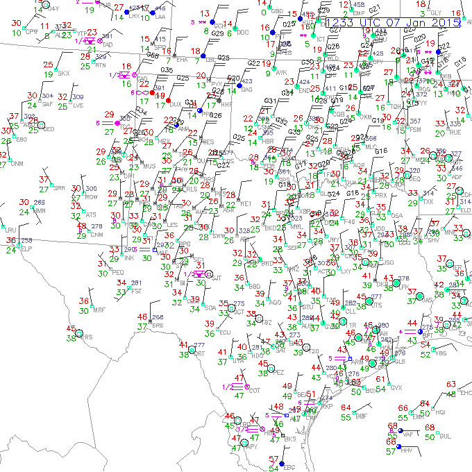 The wind shift has passed College Station, but the colder air is lagging behind back up into N Texas. The strongest barometric pressure I could find this morning was near Rapid City, SD with a 1054mb reading. Lots of light snow and negative temperatures across the Northern Plains and the Northern Rockies this morning. Still some -36F readings in Eastern Alaska and some -40C readings in the NW Territories of Canada.