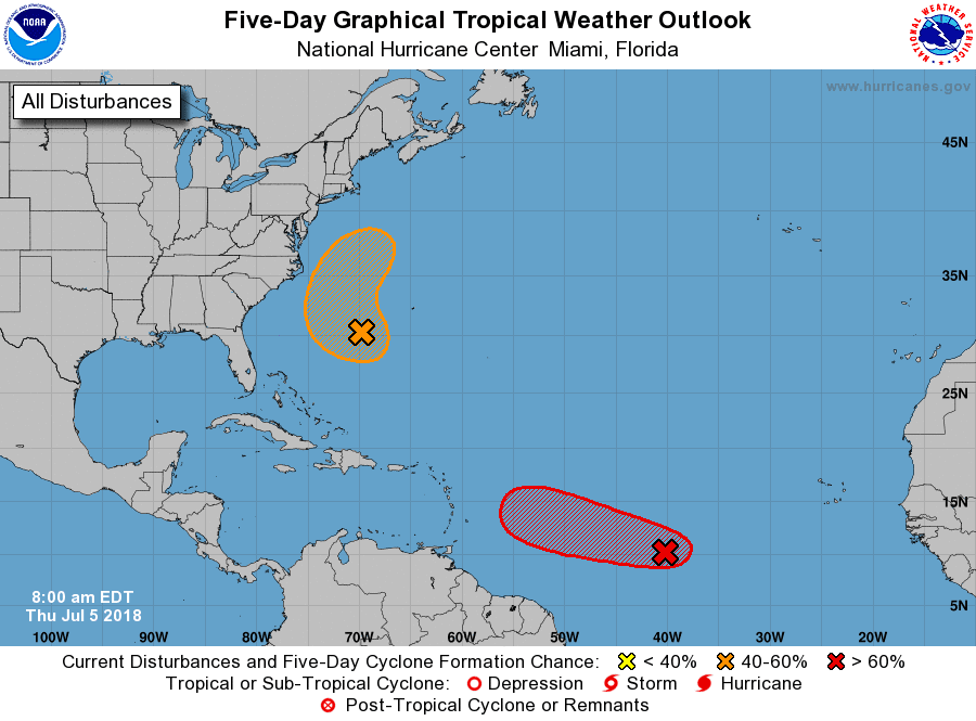 NHC is currently monitoring two area over the Atlantic Ocean…both have the potential for tropical cyclone development, but both currently pose no threat to any land areas. While the southern system looks impressive on satellite, any development is likely to be short lived as the feature moves into increasingly unfavorable conditions in the next 72 hours.