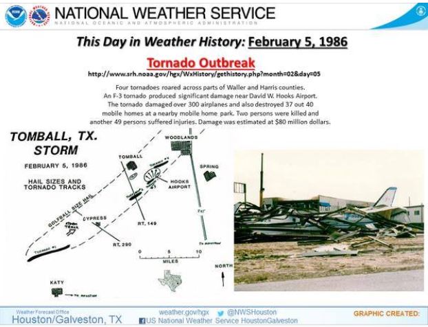 A supercell thunderstorm tracked through the Tomball area northwest of Houston, TX and produced four tornadoes along with damaging microburst winds and up to tennis ball size hail. An F3 tornado killed two people, injured 80 others and devastated a mobile home park and the David Wayne Hooks Airport. 300 aircraft were either damaged or destroyed. Much of the more substantial hail was propelled by 60 to 80 mph winds, resulting in widespread moderate damage. Total damage from this storm was 80 million dollars.