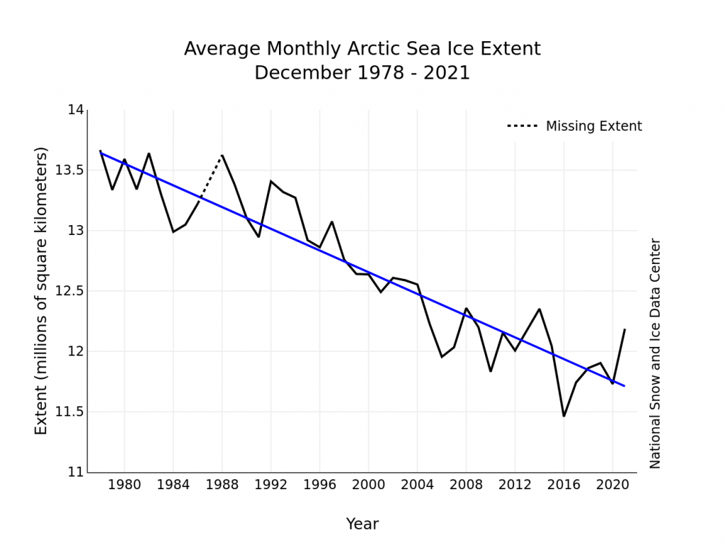 Average Arctic sea ice extent for December 2021 was 12.19 million square kilometers (4.71 million square miles), which ranked thirteenth lowest in the satellite record. The 2021 extent was 650,000 square kilometers (251,000 square miles) below the 1981 to 2010 average.